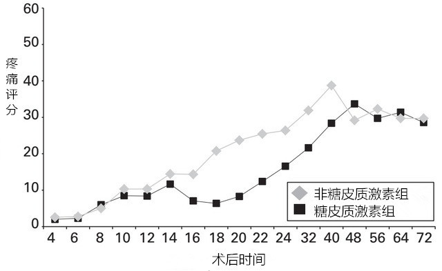 图示为 TKA 术后糖皮质激素组与非糖皮质激素组的疼痛评分